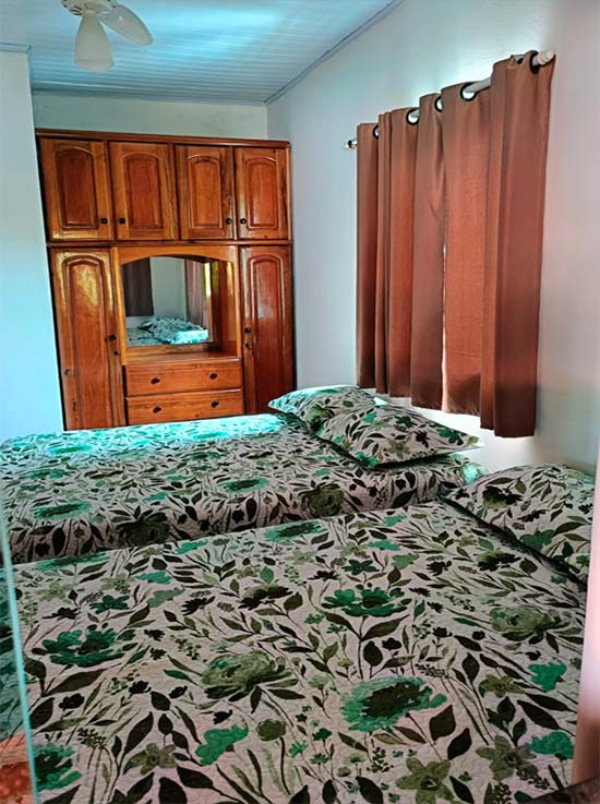 Casa com dois quartos com ventiladores, sendo uma suíte, 2 banheiros, sala, cozinha completa, TV com antena Oi, área de serviço, estacionamento, área de churrasco e ducha. A 200 metros da praia.